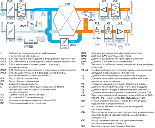 - Возможные опции WT температура воздуха по температуре воды PW дополнительный водяной калорифер CF дополнительный охладитель и управление ККБ DS диспетчеризация.